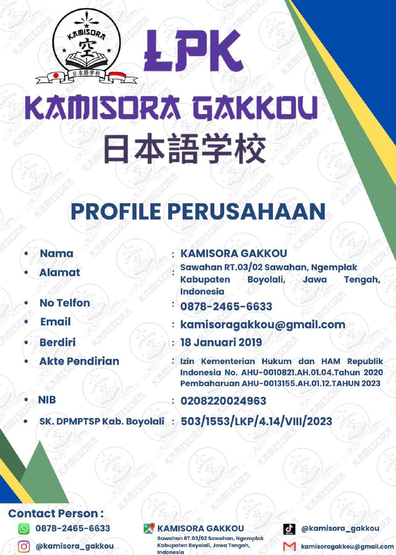 Kami adalah LPK Kamisora Gakkou, menyediakan layanan kerja di Jepang dengan biaya talang yang terjangkau dan transparan. Bergabunglah dengan kami untuk memulai karir impian Anda di luar negeri.